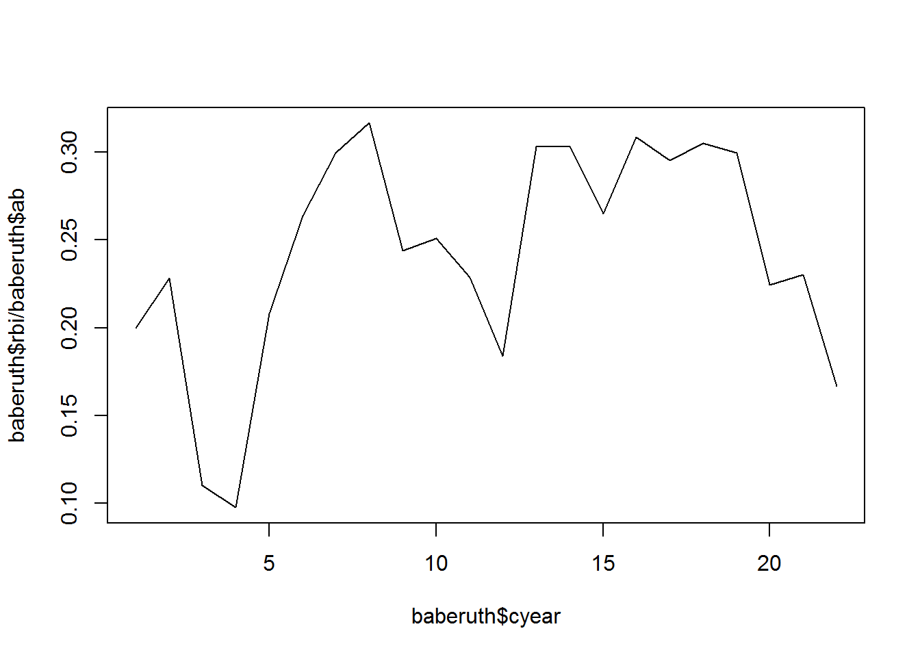 plot(baberuth$cyear,baberuth$rbi/baberuth$ab,type = "l")