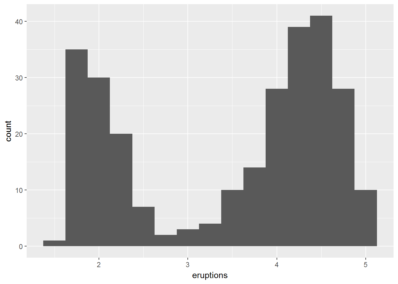 ggplot(data = faithful, mapping = aes(x = eruptions)) +