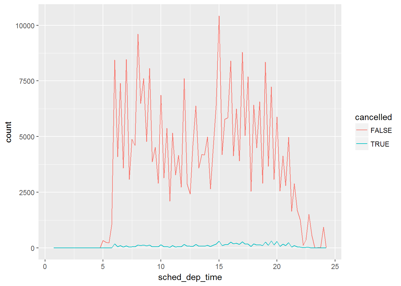 geom_freqpoly(mapping = aes(colour = cancelled), binwidth = 1/4)+
