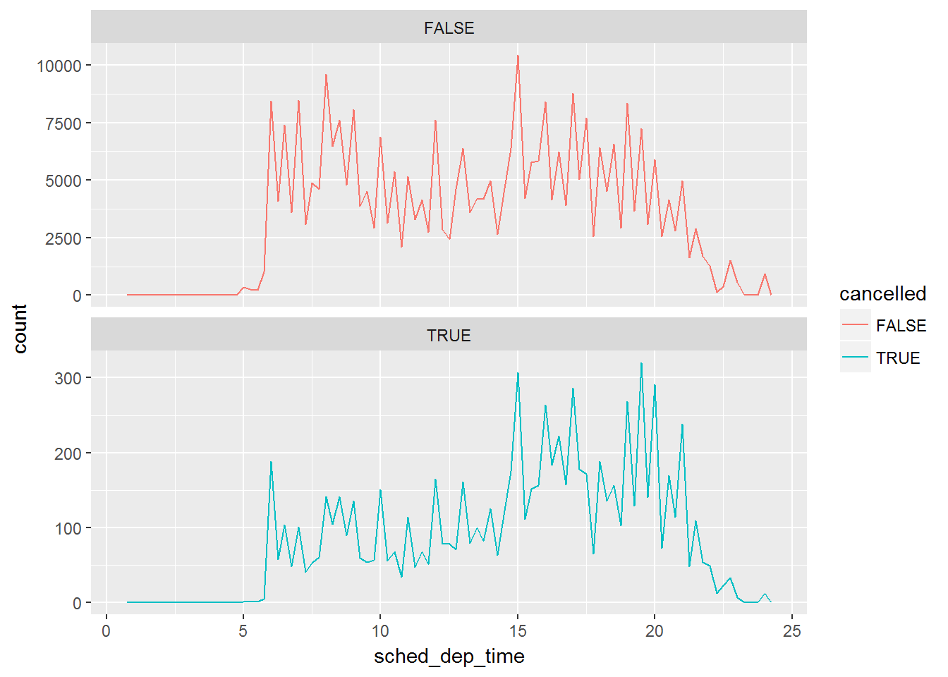 facet_wrap(~cancelled,nrow = 2,scales = "free_y")