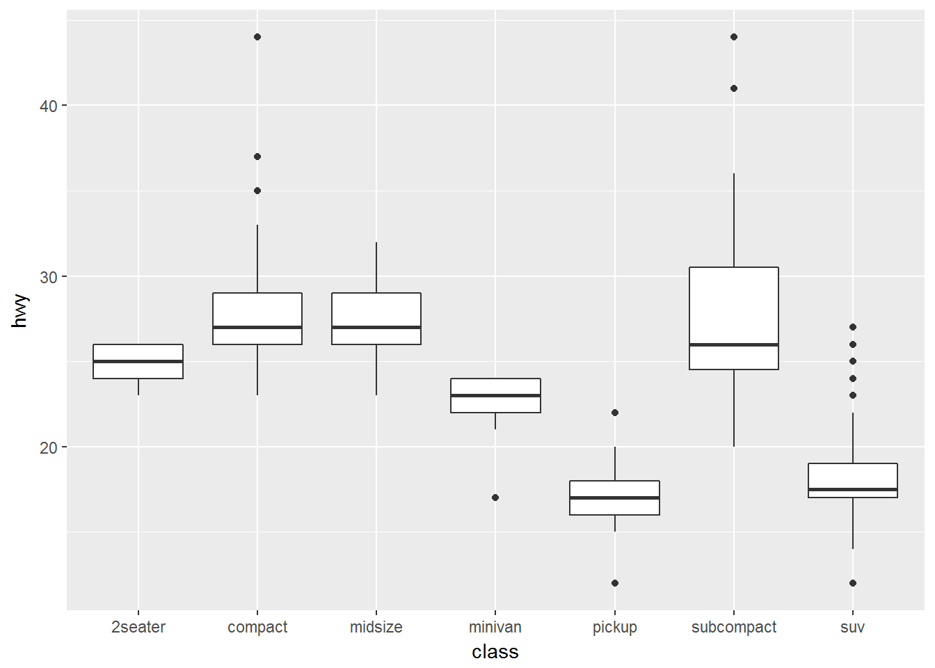 ggplot(data = mpg, mapping = aes(x = class, y = hwy)) +