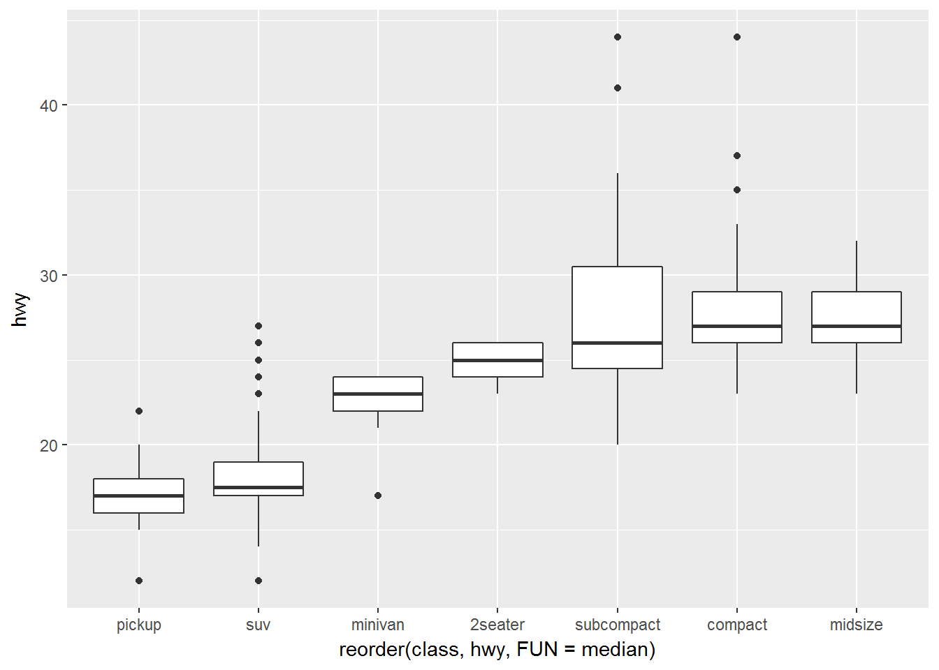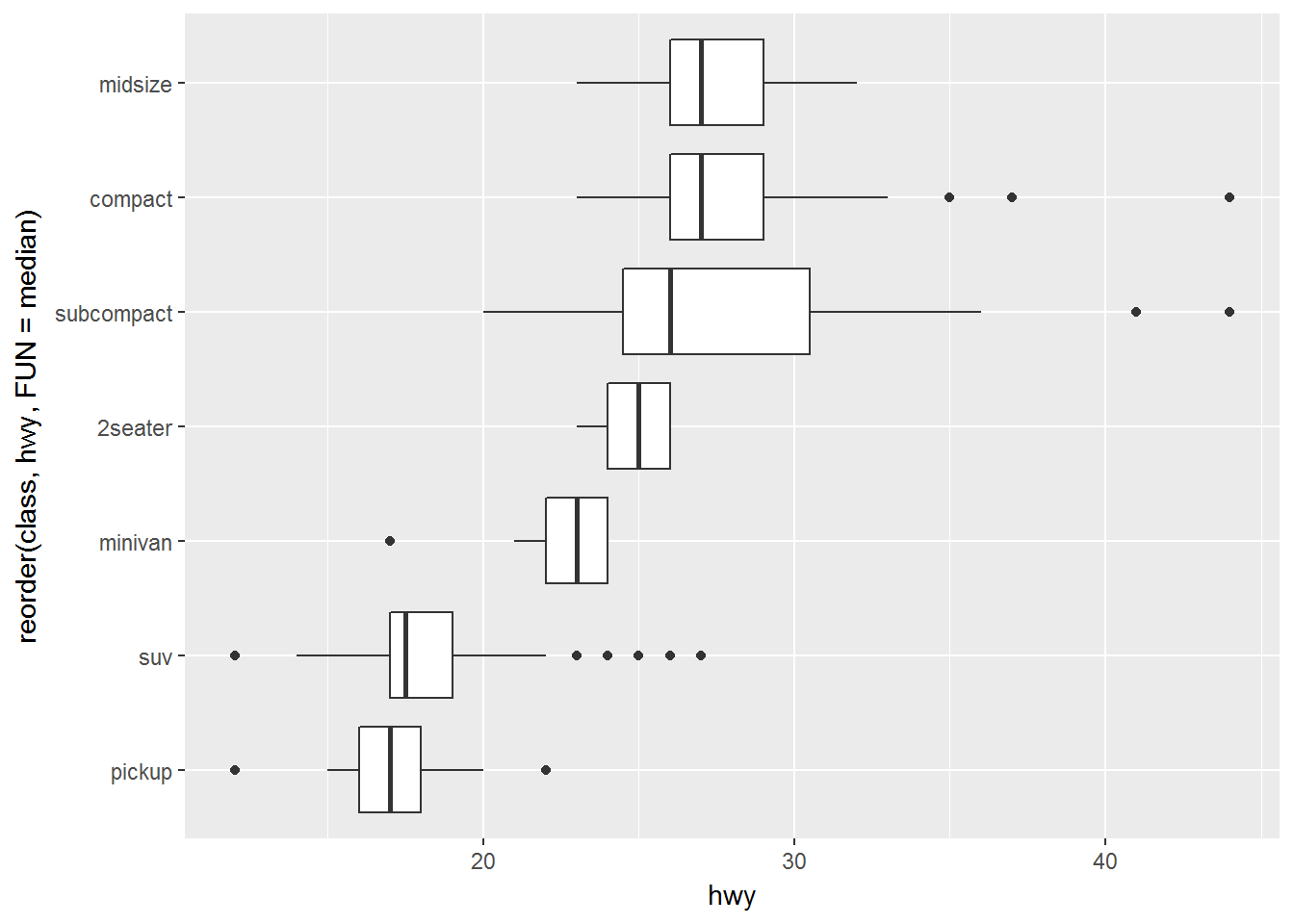 geom_boxplot(mapping = aes(x = reorder(class, hwy, FUN = median), y = hwy)) +