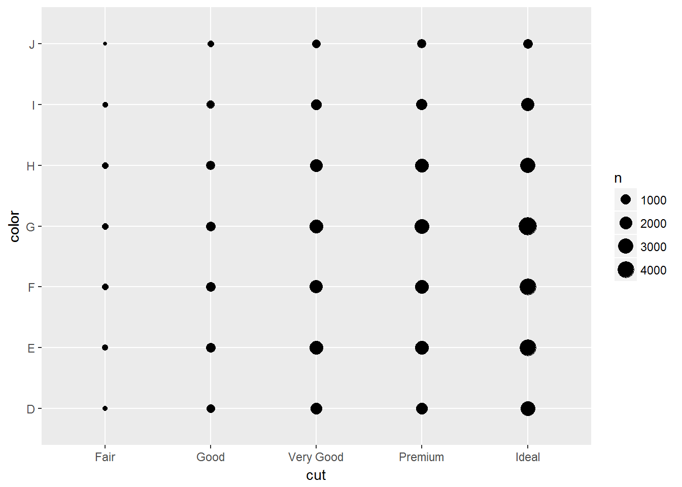 geom_count(mapping = aes(x = cut, y = color))