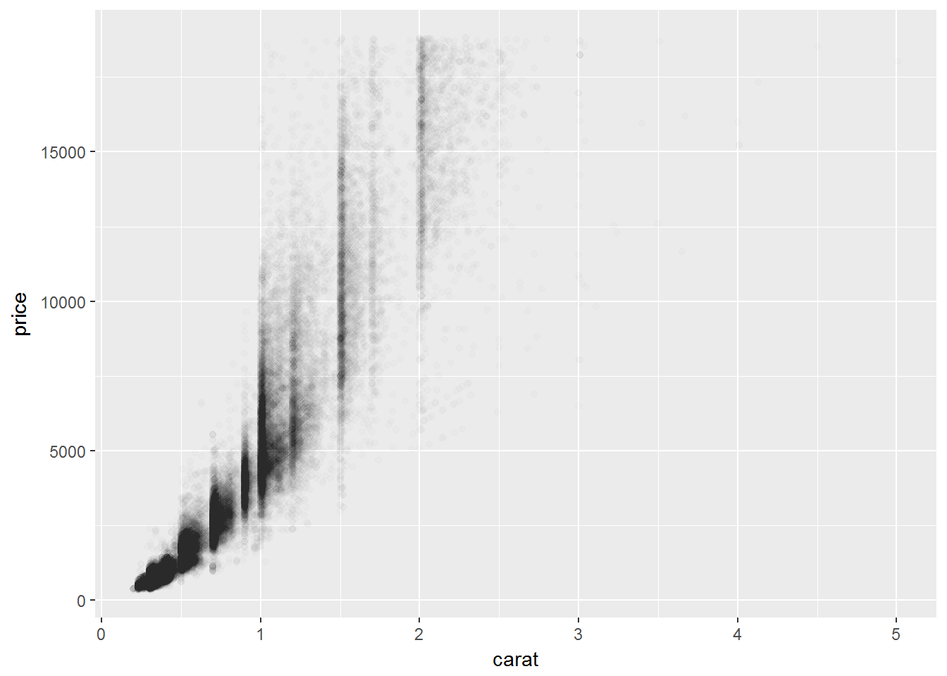 geom_point(mapping = aes(x = carat, y = price), alpha = 1 / 100)