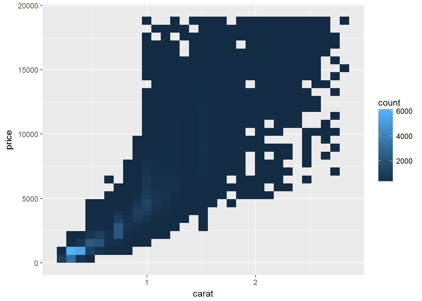 geom_bin2d(mapping = aes(x = carat, y = price))