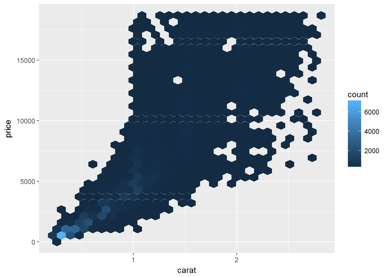 geom_hex(mapping = aes(x = carat, y = price))