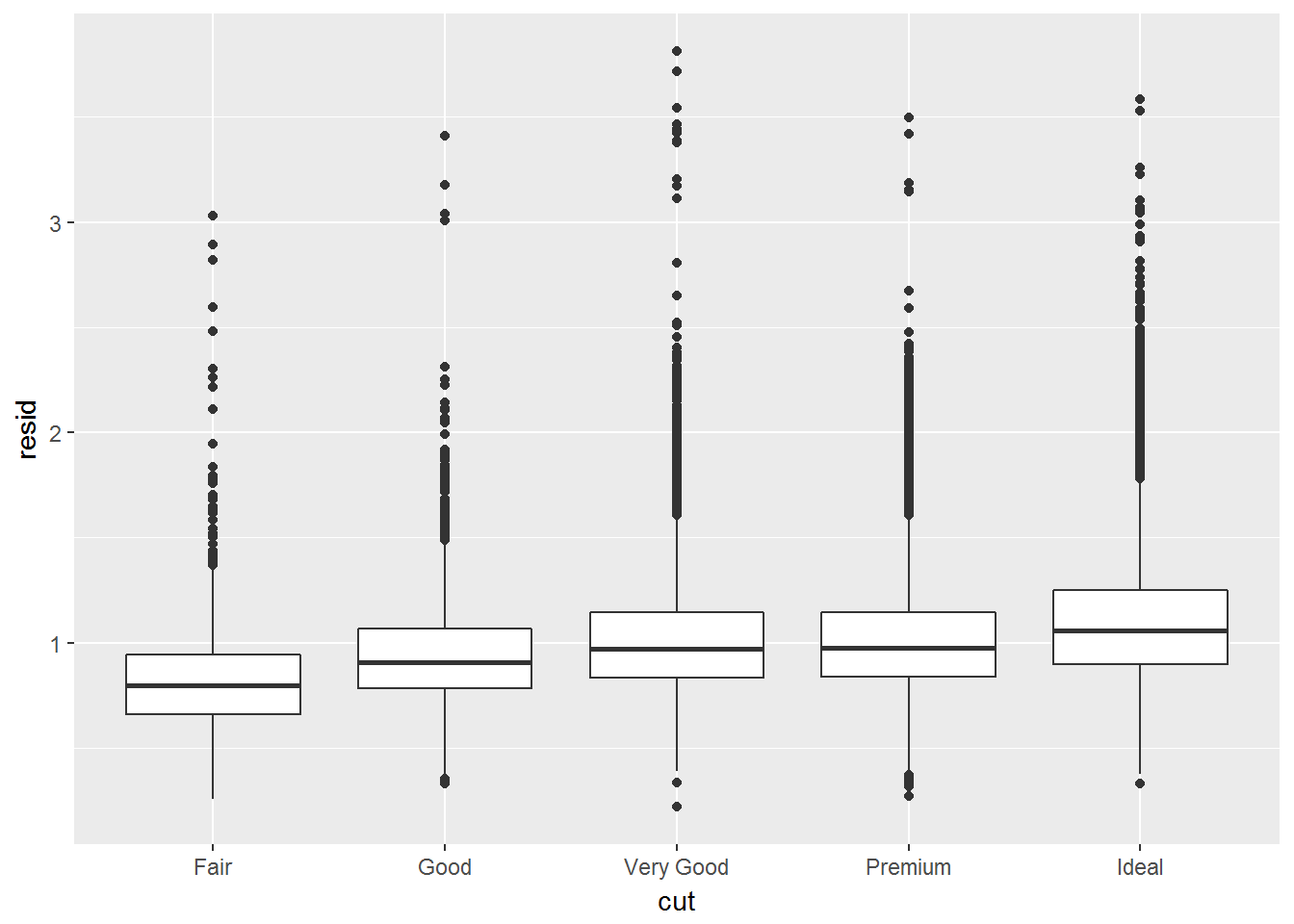 geom_boxplot(mapping = aes(x = cut, y = resid))