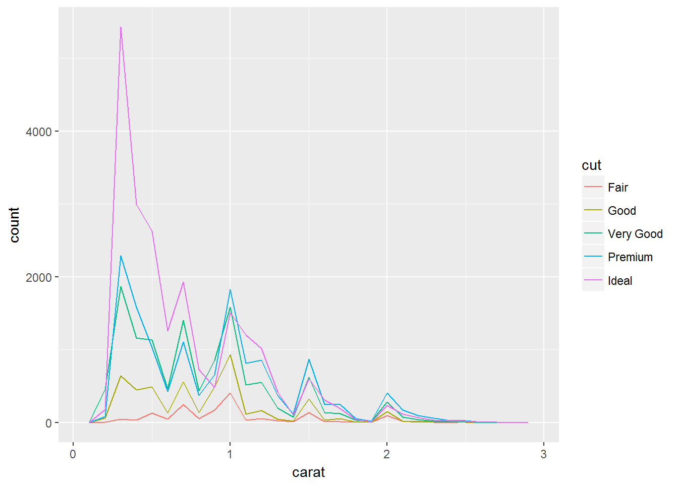 geom_freqpoly(mapping = aes(colour = cut), binwidth = 500)